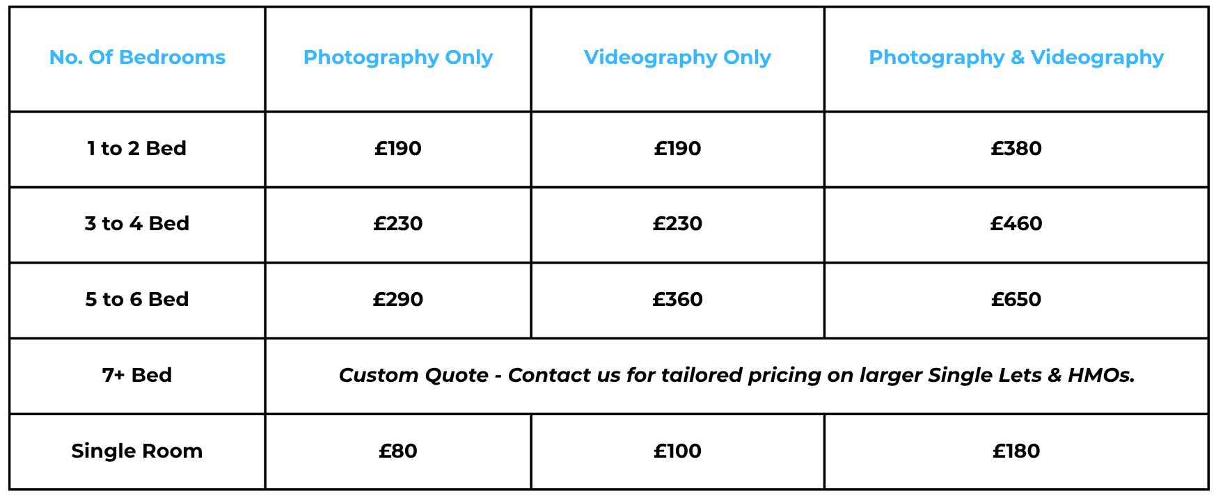 All prices include interior and exterior photography/videography, full editing, and delivery in high-resolution formats.
